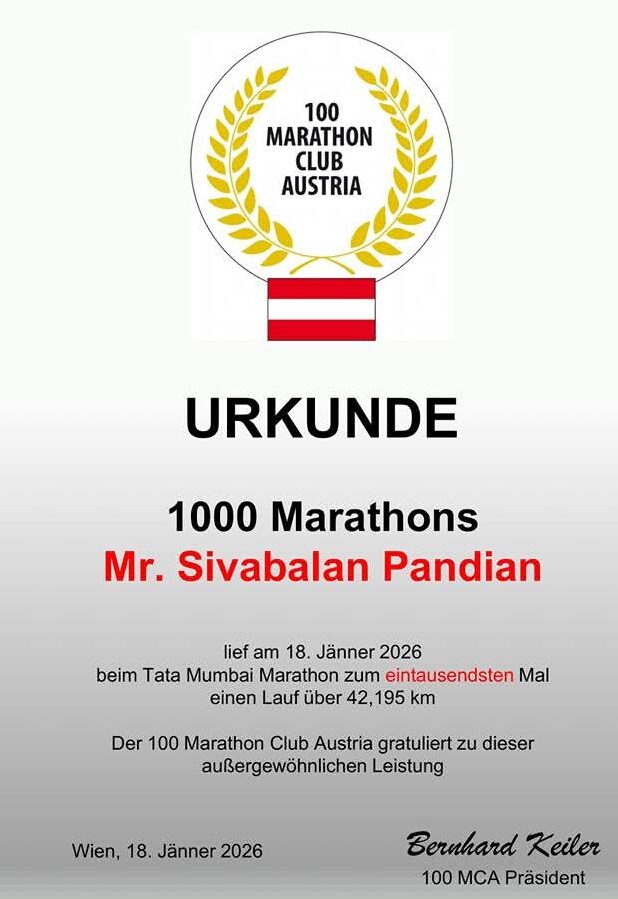 Am 18. Jänner 2026 finishte unser indische Clubkollege Sivabalan Pandian beim Tata Mumbai Marathon (IND) seinen 1000sten Marathon + Ultra! Wir gratulieren sehr herzlich zu dieser außergewöhnlichen Ausdauerleistung und wünschen ihm das Allerbeste für eine erfolgreiche Fortsetzung seiner Laufkarriere!!!